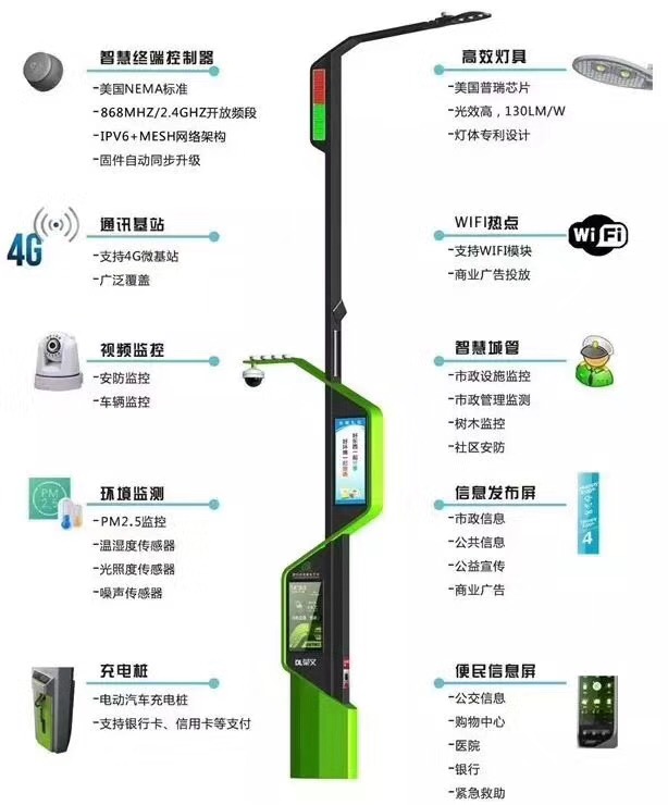 昆明官渡森林公園智慧路燈示範項目采用在路燈上搭載各種傳感器及感知設備,包括充電樁、LED信息發布屏、高清攝像頭、應急報警、5G基站搭載網絡、停車檢測、環境監測、井蓋及積水監測、城市廣播等,利用物聯網及互聯網技術,使路燈成為智慧城市信息采集終端和便民服務終端,是智慧城市重要的切入口。